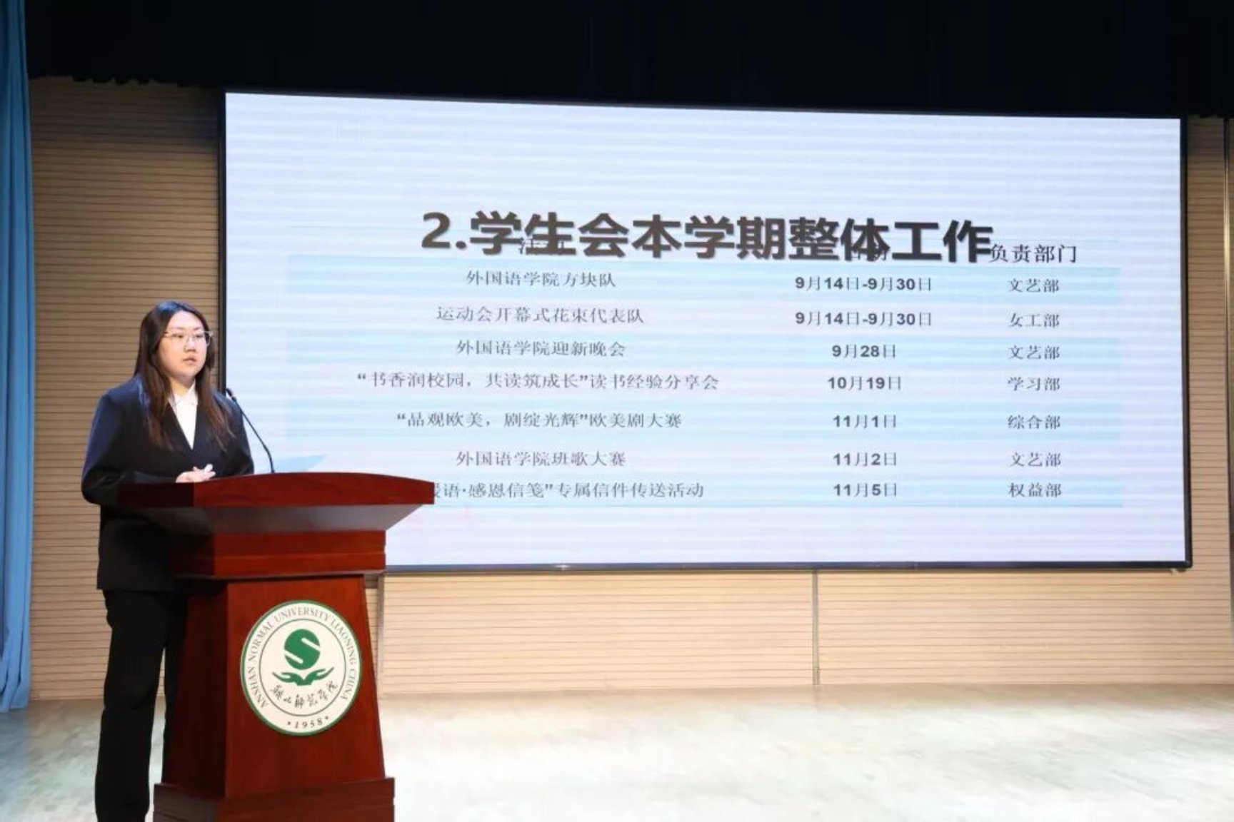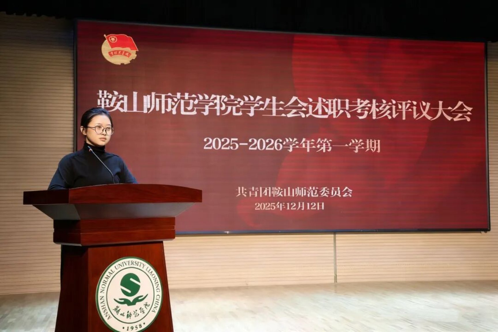 为贯彻落实《关于推动高校学生会(研究生会)深化改革的若干意见》的相关要求,加强学生组织建设,提升学生干部综合素质,践行学生会“全心全意为同学服务”的宗旨,2025年12月12日,鞍山师范学院2025—2026学年第一学期学生会述职考核评议大会于兰芳书场顺利召开。校学生会秘书长张稚晗,校、院两级学生会主席团成员出席会议。校学生会主席团成员肖雅心主持会议。